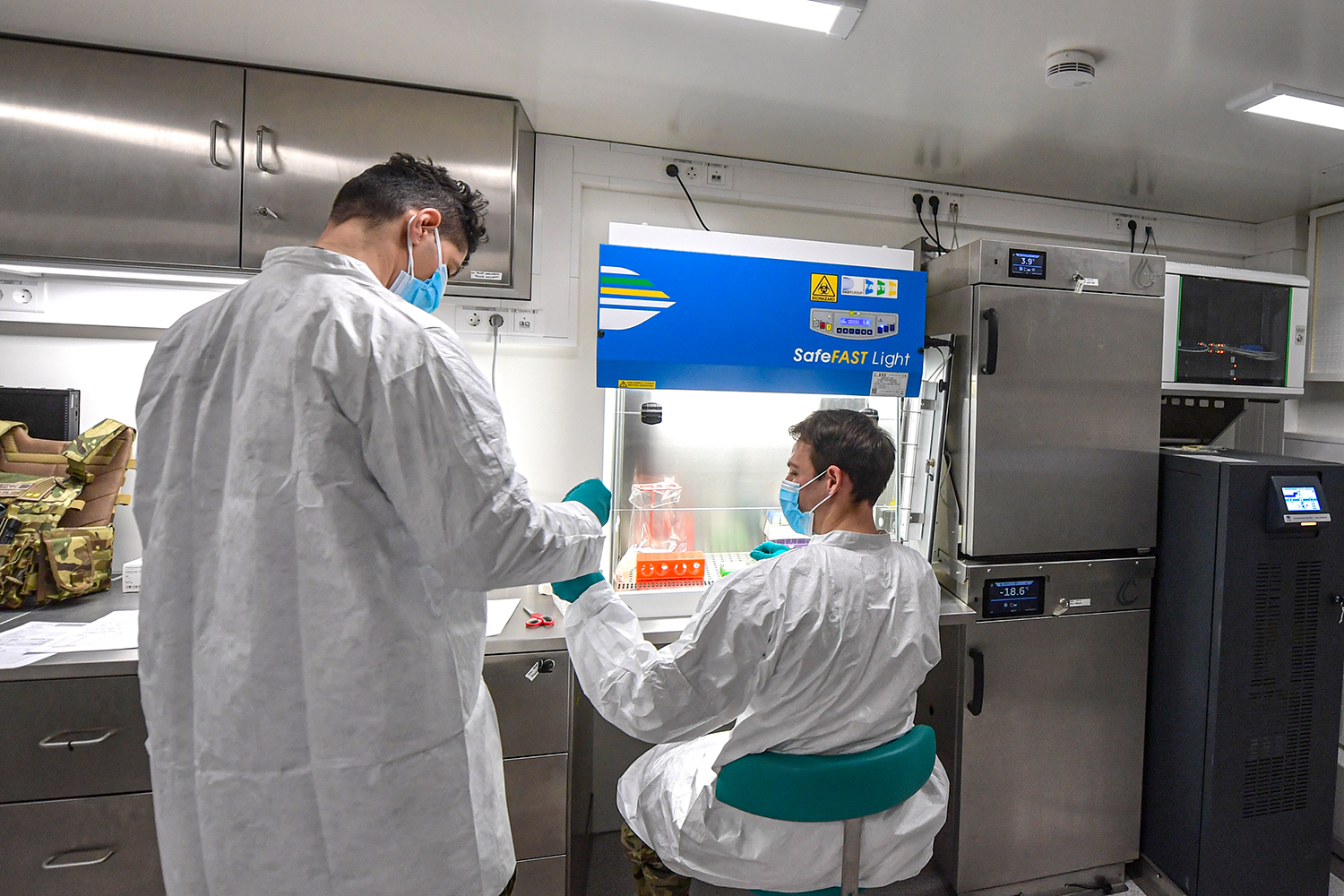 „Van, hogy klinikai mintákat dolgozunk fel, majd a külső beavatkozás megkívánja a környezeti minták azonosítását is. Élelmiszerekből és vízből kinyert anyagokat szintén elemzünk” – mondta Pereszlényi alezredes az MH EK két laboratóriumi konténere kapcsán. „A kórokozók veszélyességük alapján négy kategóriába sorolhatók. A jelenlegi struktúrában a BSL–2 szintbe tartozó ágensek teljeskörűen és biztonságosan vizsgálhatók, ugyanakkor magasabb kockázatú események esetén a fenyegetettséghez igazodó, magasabb biológiai biztonsági szintű telepíthető képességek is alkalmazhatók”.
