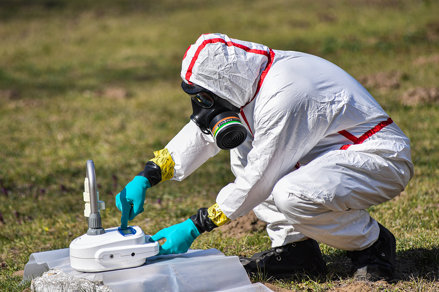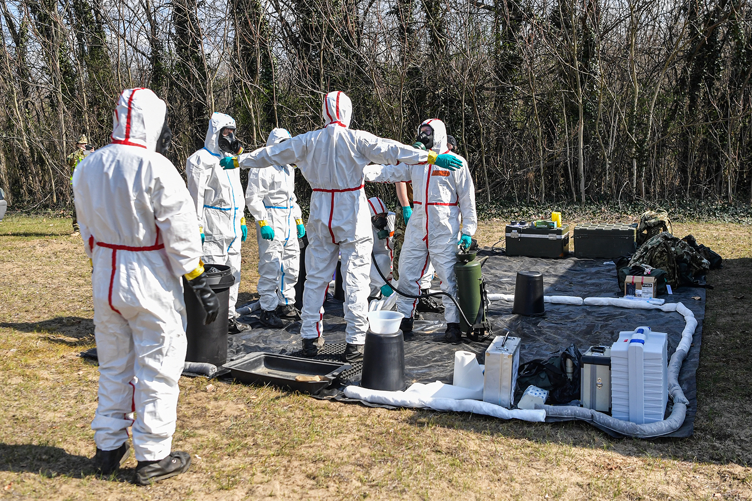 A csoport feladata azonban nem ért véget a mintavétellel, hívta fel a figyelmet rá a telepíthető képesség mintavevő tisztje. A mentesítő állomásra visszatérve különböző folyékony anyagokkal fertőtlenítették az állományt. „A fertőtlenítő anyagok úgynevezett behatási idejének lejárta után vehetjük le védőruhánkat és távozhatunk az állomásról. Biológiai anyagoknak ellenálló, ám egyszer használatos könnyűruházatról van szó, amit később megsemmisítenek. Ez alól kivételt képez a szintén biovédelmet biztosító gázálarc” – mondta a nemzetközi gyakorlatra készülő Szilágyi főhadnagy.
