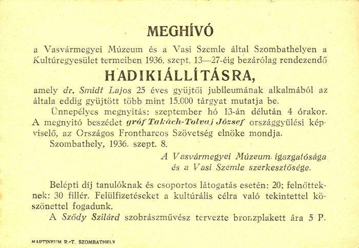 Meghívó a hadikiállításra. Forrás: Keppel Csilla: Dr. Smidt Lajos mint múzeumalapító. In: Vasi Szemle. 2014. 1. sz. URL: https://epa.oszk.hu/03300/03366/00088/keppel.htm
