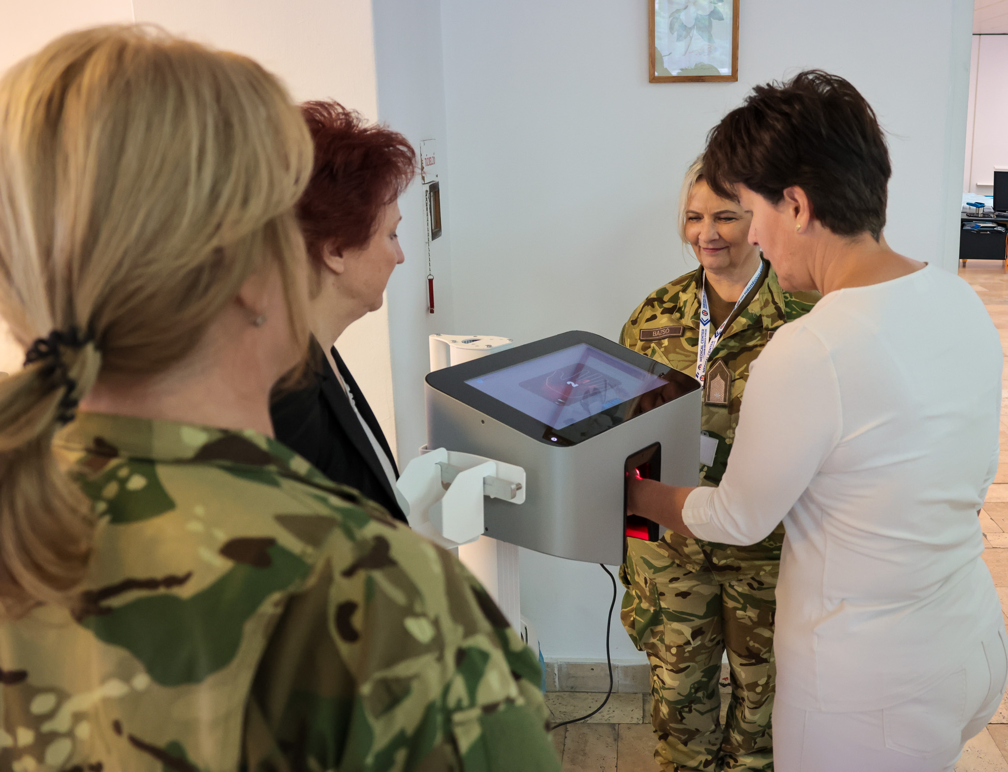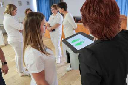 A képzés részeként kihelyeztek egy Semmelweis Scannert, amely korszerű technológiával segíti a kézfertőtlenítés hatékonyságának ellenőrzését. A Semmelweis Scanner azonnali, objektív kézfertőtlenítési-kiértékelést tesz lehetővé egy speciális, UV reagens anyagot tartalmazó kézfertőtlenítőszer eloszlásának kimutatásával. Ehhez a szkenner UV-A megvilágítást és AI alapú képfeldolgozó algoritmust használ. A termék a legkorszerűbb szoftveres technológiákat alkalmazva, átfogó minőségértékelési pontozást alkalmaz és objektív visszajelzést ad a kézhigiéné minőségéről. A Semmelweis Scanner használatával kapcsolatos további tudnivalókat és szakmai elvárásokat Bohdaneczky Éva a HandInScan Zrt. menedzsere ismertette a résztvevőkkel. Az innovatív, magyar fejlesztésű higiénia mérőeszköz két hétig segíti az intézet dolgozóinak munkáját a valós tapasztalatokon alapuló betegbiztonság fejlesztése érdekében.