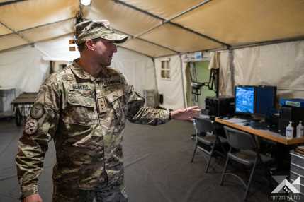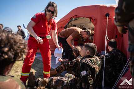 Szerző: Bányász Eszter | Fotó: Schöff Gergely |  2024. május 9., csütörtök 11:08Német elmaszkírozott sebesültekért száll fel a román mentőhelikopter. Fertőzés gyanúja áll fenn, így még nem landol az átalakított Black Hawk, mikor a brit dekontamináló század munkaállomása már áll – megfeszített munkával körülbelül tíz perc alatt húzták fel a sátraikat. Az ellenőrzés után belga mentőautóval szállítják a sérülteket az amerikai Role-2 sátorba. Ez a Vigorous Warrior 2024, a NATO egyetlen katona-egészségügyi gyakorlata.