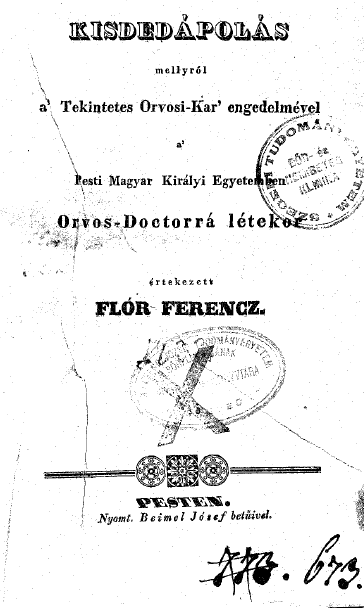 Flór Ferenc orvosdoktori disszertációjának címoldala. URL: http://misc.bibl.u-szeged.hu/id/eprint/45664