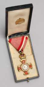Ferenc József-rend, koronás arany érdemkereszt a vitézségi érem szalagján (Múzeum Digitár Budapest, URL: https://bu.hu.museum-digital.org/object/678334 )