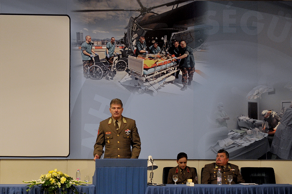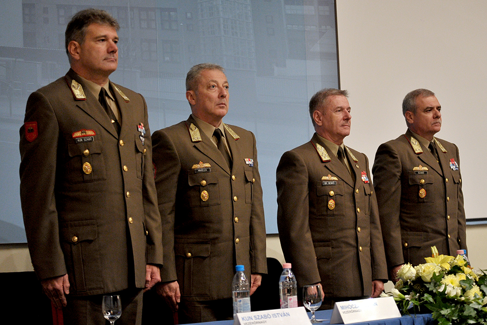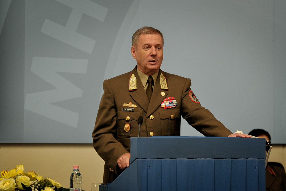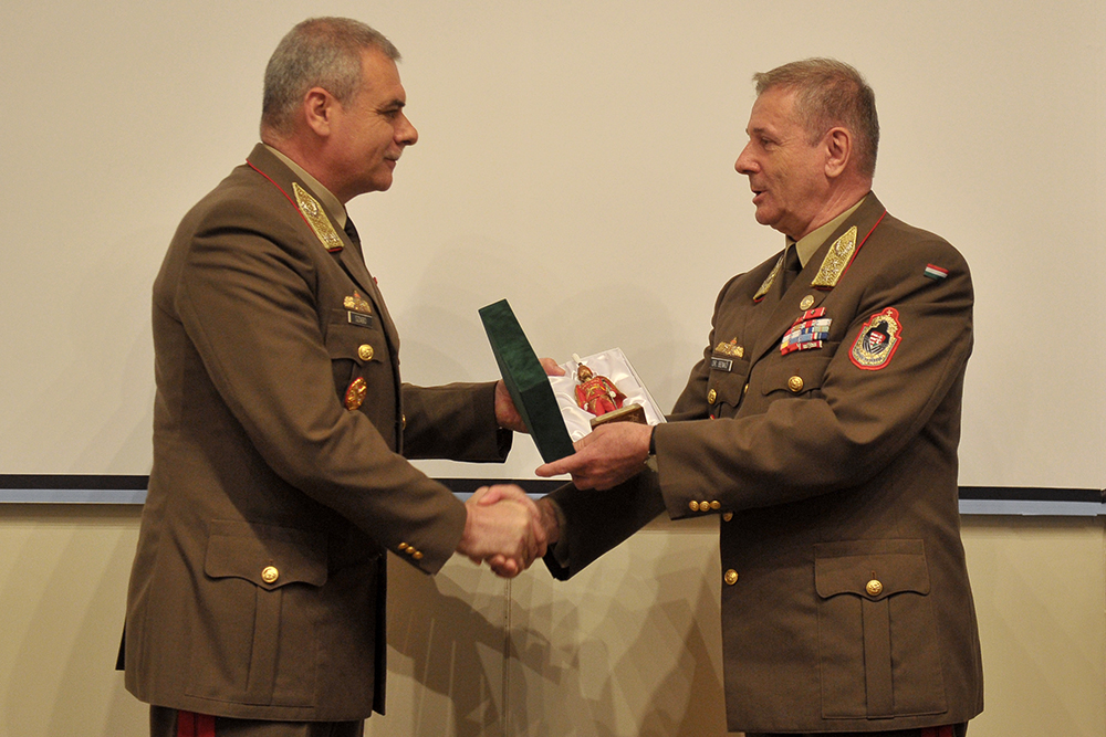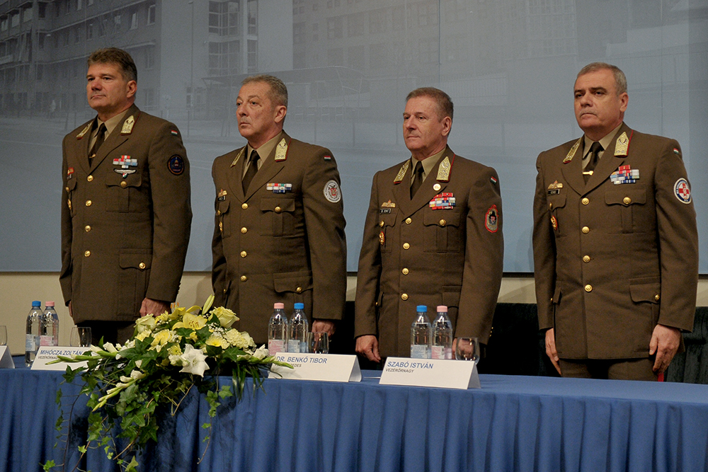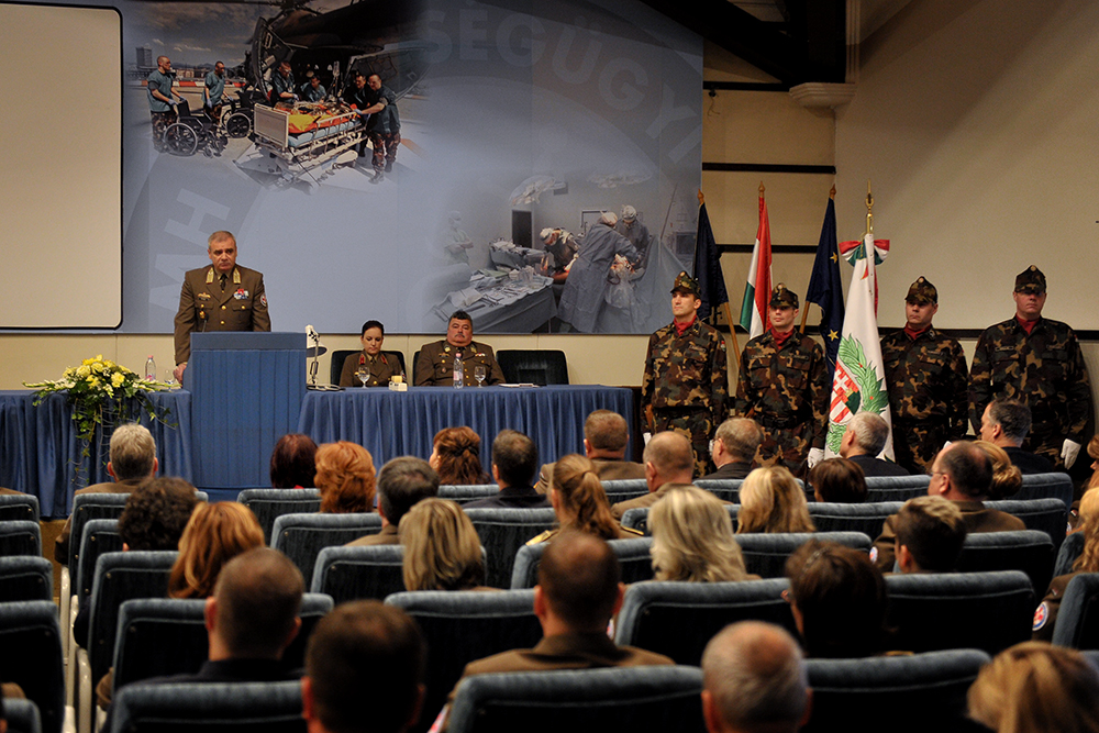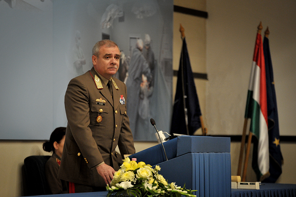 2017. szeptember 29., péntek 12:46Az elmúlt években végzett magas színvonalú, fegyelmezett szakmai munka folytatása mellett kötelezte el magát Kun Szabó István vezérőrnagy, az MH Egészségügyi Központ új parancsnoka. A tábornok dr. Benkő Tibor vezérezredes, Honvéd Vezérkar főnök, illetve elődje, Szabó István vezérőrnagy jelenlétében vette át a beosztást szeptember 29-én, Budapesten.