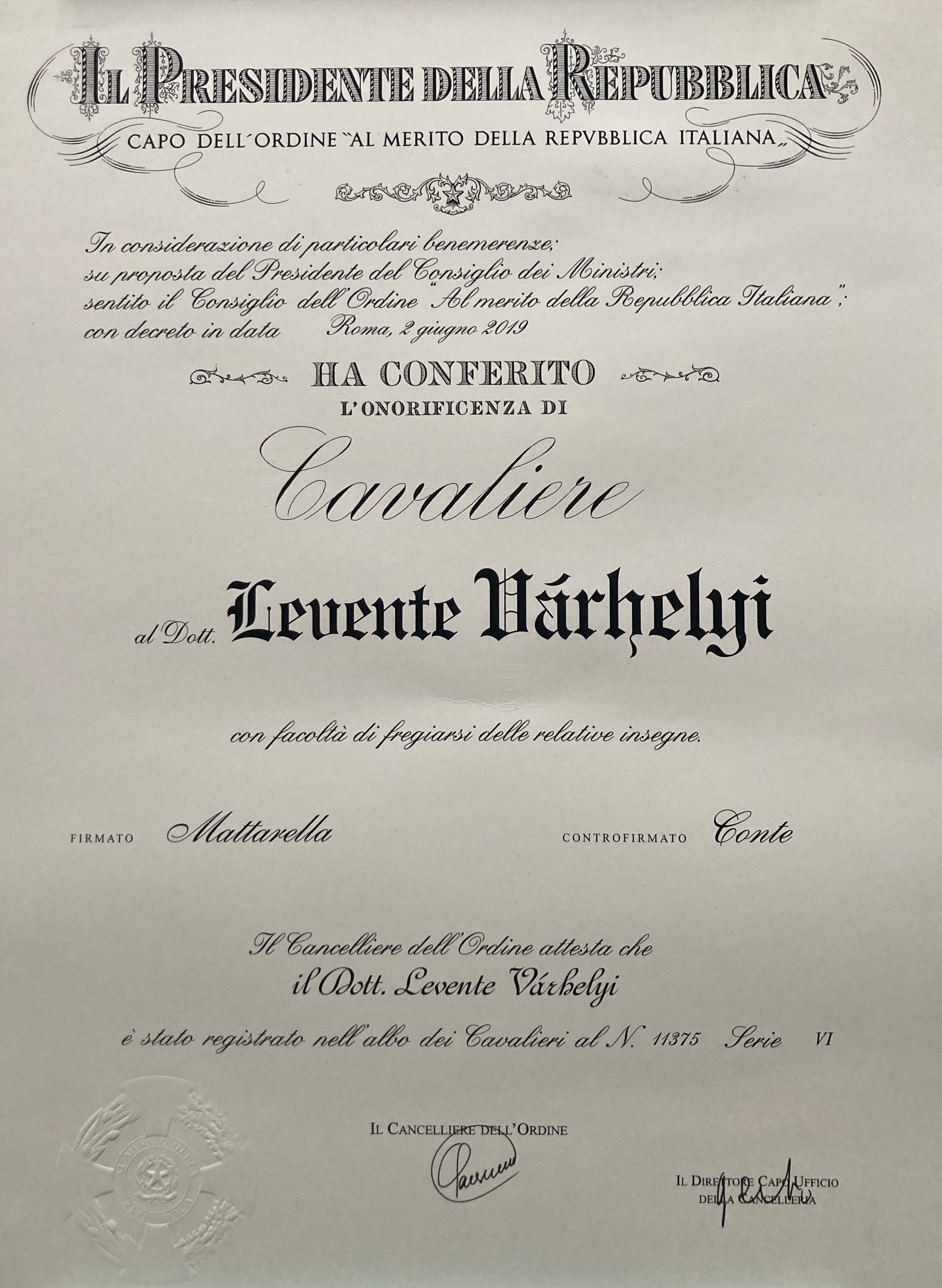 Az olasz állami kitüntetés méltó elismerése Dr. Várhelyi Levente PhD ezredes kiemelkedő szakmai teljesítményének és elhivatottságának.