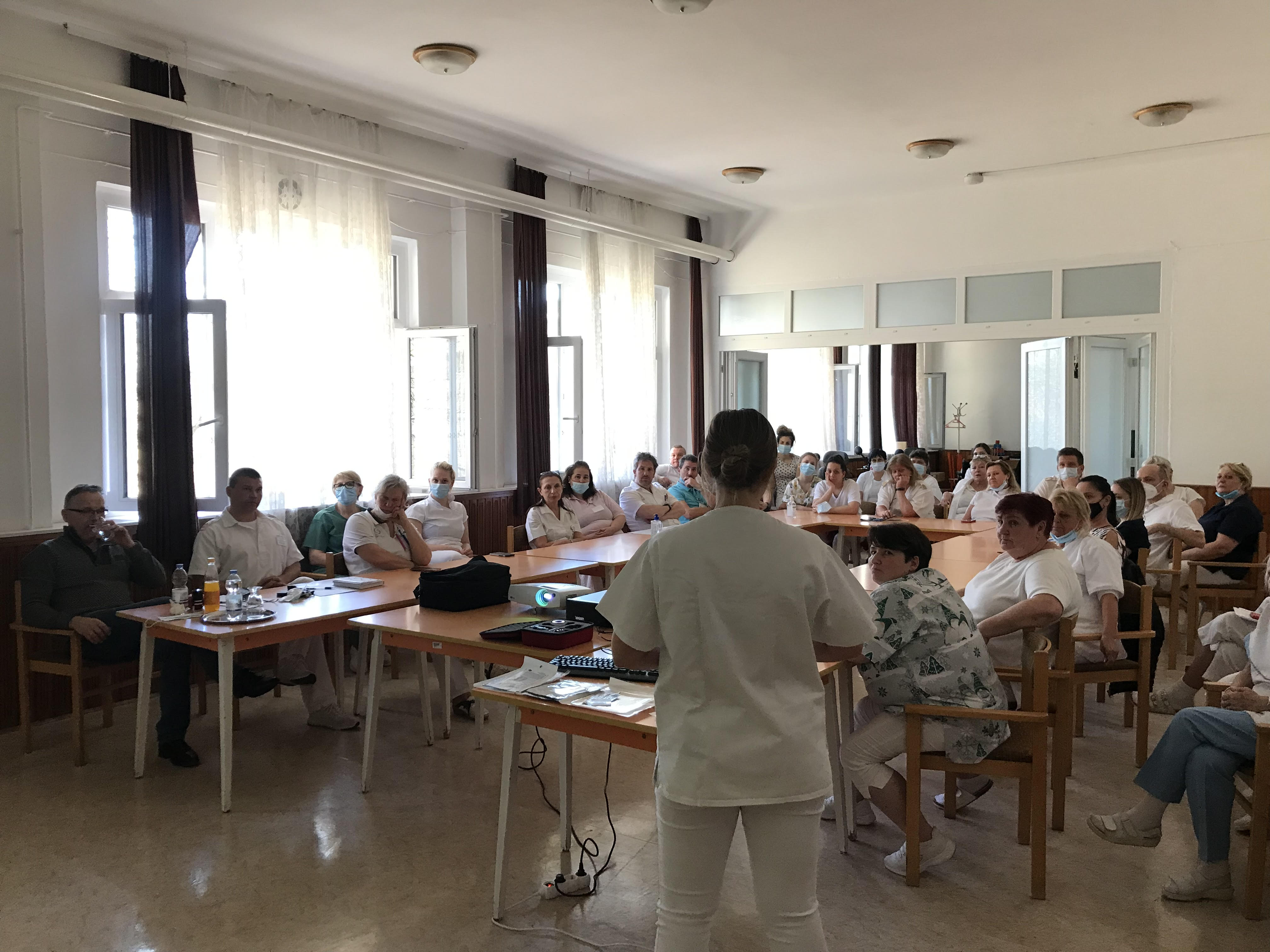 2022. március 24., csütörtök 13:52Gyakorlati szemléletű előadást tartott Lengyel Dóra diplomás ápoló, valamint Dr. Mérai András alezredes 2022.március 23-án. Az MH Egészségügyi Központ szakemberei által, a Szanatórium utcai telephelyen megrendezett szakmai műhely az első alkalma volt egy jövőbemutató programnak, amely során a telephely, illetve az intézmény dolgozói lehetőséget kapnak különböző szakmai egyeztetésekre, valamint ismereteik közös bővítésére.