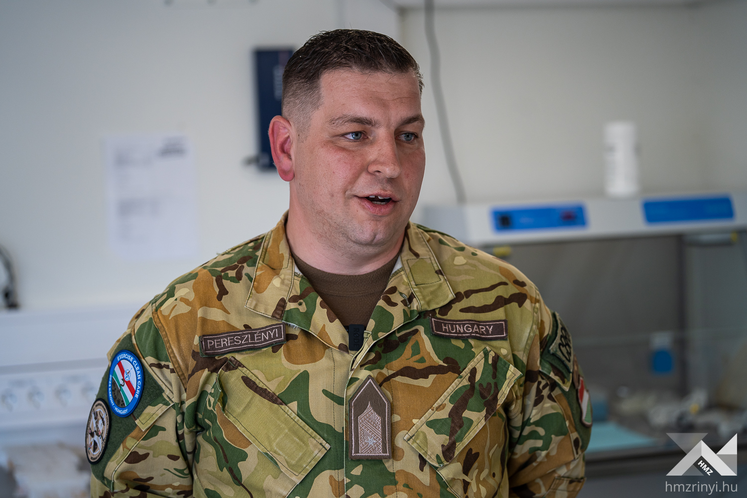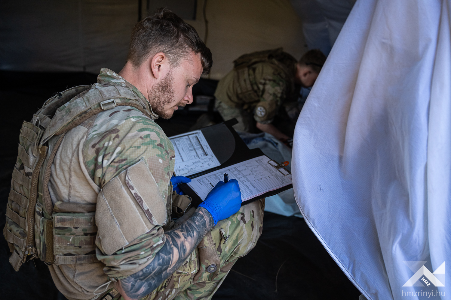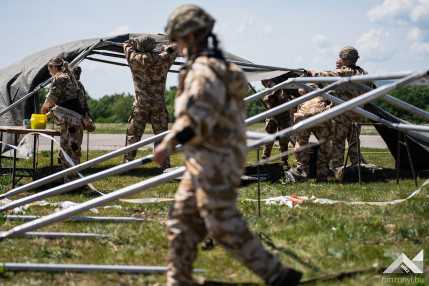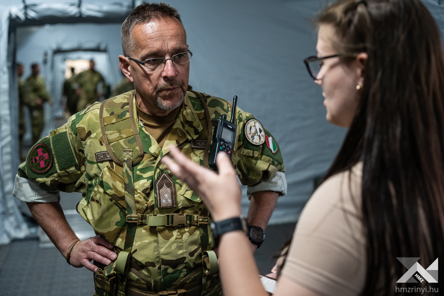 Szerző: Bányász Eszter | Fotó: Schöff Gergely |  2024. május 9., csütörtök 11:08Német elmaszkírozott sebesültekért száll fel a román mentőhelikopter. Fertőzés gyanúja áll fenn, így még nem landol az átalakított Black Hawk, mikor a brit dekontamináló század munkaállomása már áll – megfeszített munkával körülbelül tíz perc alatt húzták fel a sátraikat. Az ellenőrzés után belga mentőautóval szállítják a sérülteket az amerikai Role-2 sátorba. Ez a Vigorous Warrior 2024, a NATO egyetlen katona-egészségügyi gyakorlata.