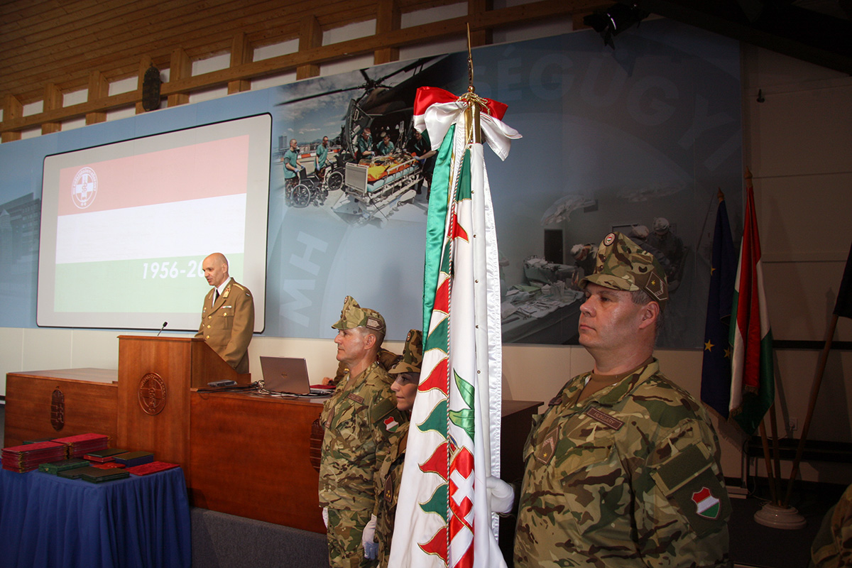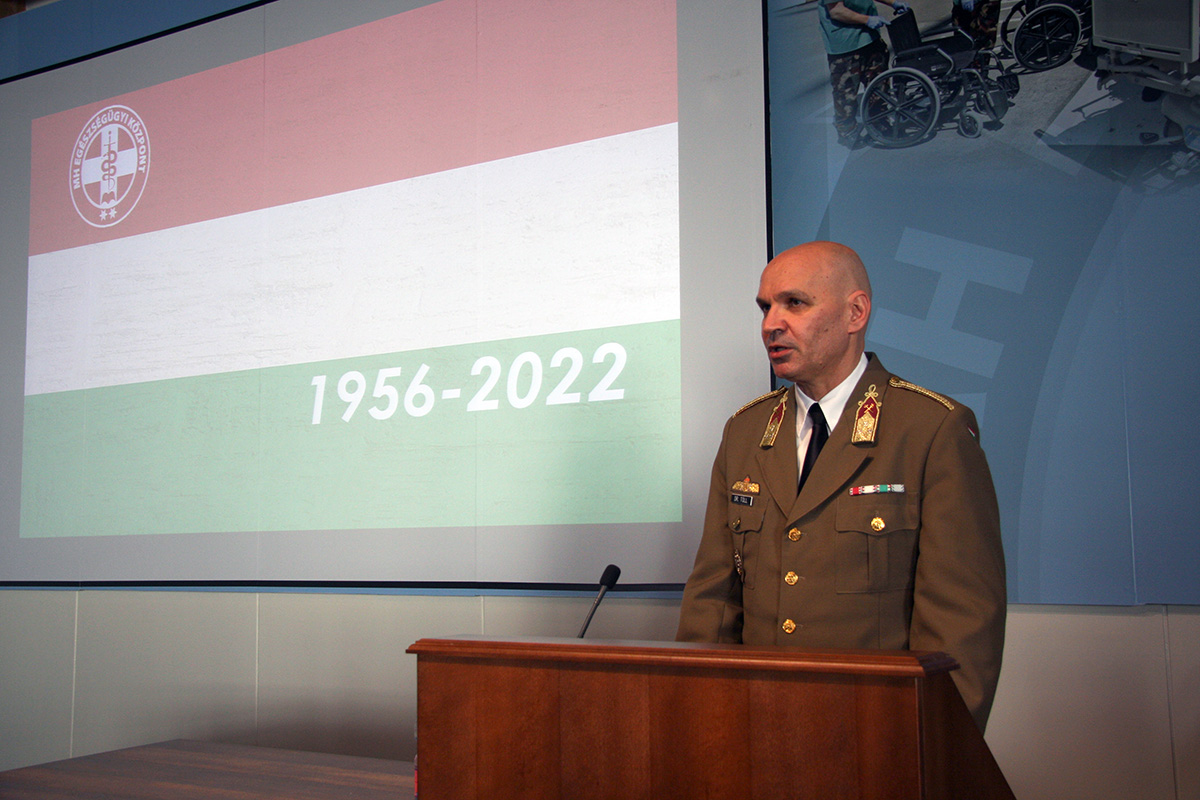 Szerző: MH Egészségügyi Központ | 2022. október 19., szerda 13:15Ünnepi állománygyűlésen emlékeztek meg az 1956-os forradalomról a Magyar Honvédség Egészségügyi Központban 2022. október 19-én. A rendezvényt megtisztelte jelenlétével Zsiga Tamás László a Honvédelmi Minisztérium humánpolitikáért felelős helyettes államtitkára.
